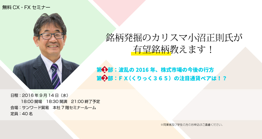 無料CX・FXセミナー「銘柄発掘のカリスマ小沼正則氏が有望銘柄教えます!」