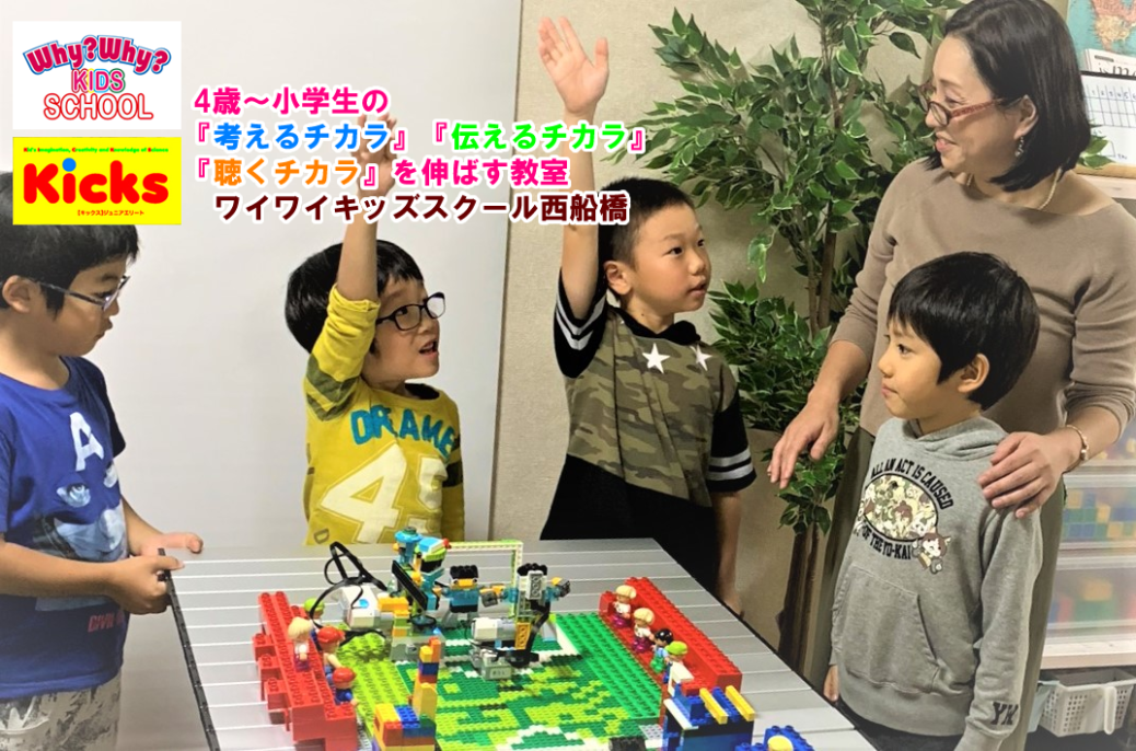 KICKS 西船橋校は、子どもがレゴ®ブロックに夢中になり、気づいた時には【考えるチカラ】が身についている、そんな仕掛けがたくさんのロボット教室です。授業を通して、学校や幼稚園では教わらない「考え方」や「伝え方」を身につけることができるようになります。