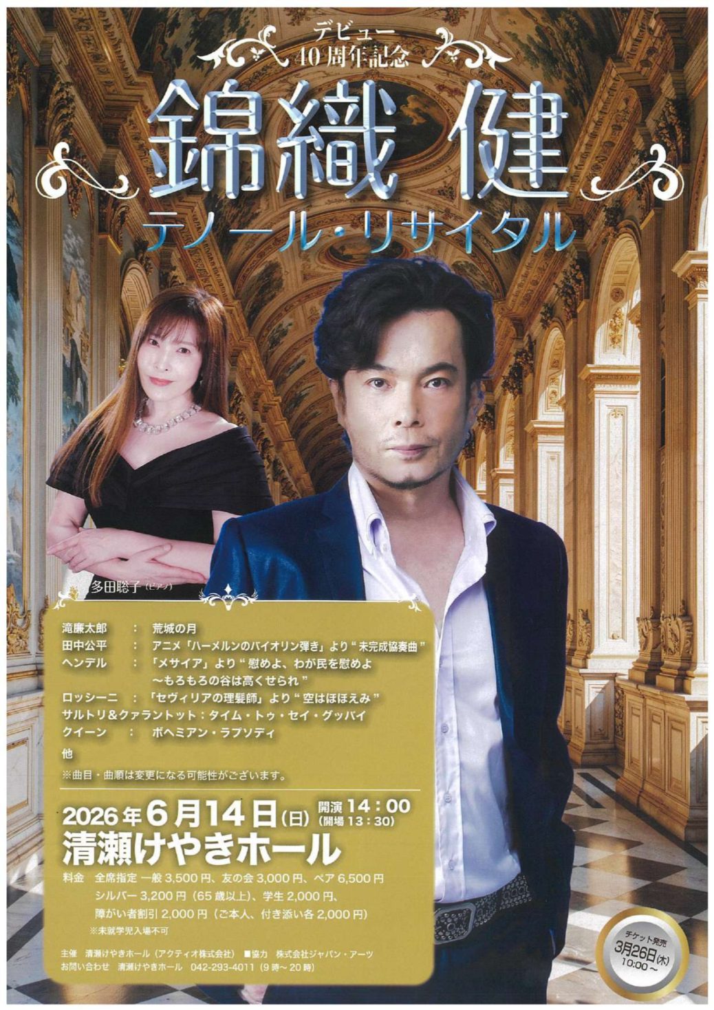 日本を代表するテノール歌手、錦織健のデビュー40周年を記念した特別なリサイタルが清瀬けやきホールにて開催されます。共演にはピアニストの多田聡子を迎え、滝廉太郎の「荒城の月」から、アニメ作品の楽曲、さらにはクイーンの「ボヘミアン・ラプソディ」まで、ジャンルを超えた多彩なプログラムを披露します。長年第一線で活躍し続ける錦織健の、磨き抜かれた歌唱力と豊かな表現力で紡がれる名曲の数々を存分に堪能できる、記念すべきステージをぜひお楽しみください。