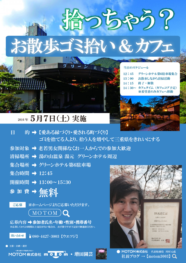【愛ある縁づくり・愛される町づくり】をテーマに、ゴミを捨てる人より、拾う人を増やして三重県をきれいにすることを目的に活動しています。
